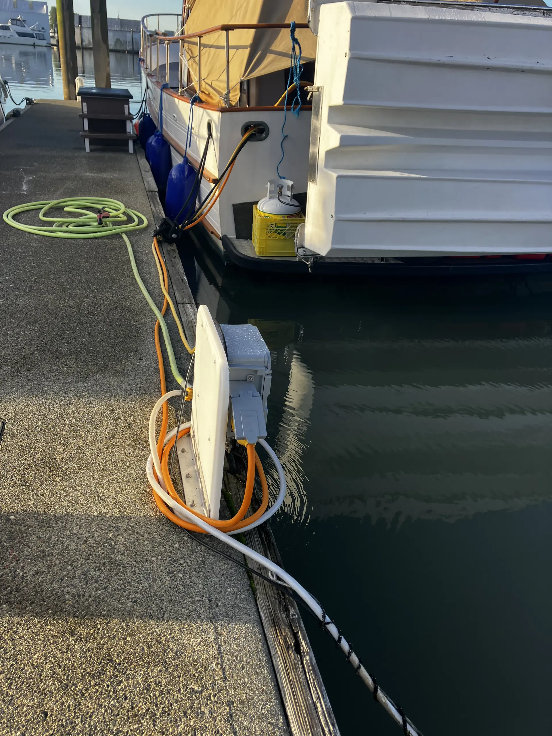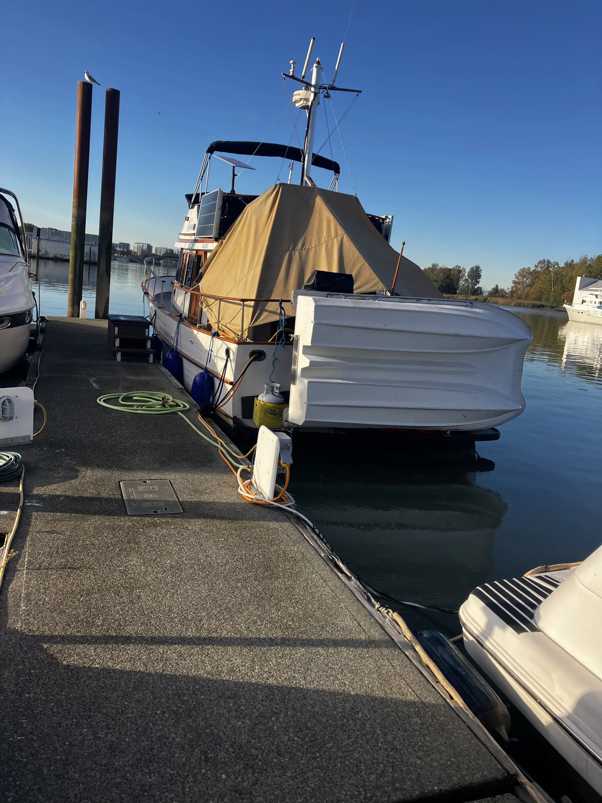 Prime Outside dock,30 amp power,water and secure gate with dob . (PRIME SECURE SLIP FOR THE FIFA WORLD CUP GAMES 2026) 1 block to sky train and 20 minutes to downtown Vancouver,10 minutes to airport. Close to all restaurants. No parking and no laundry. No sailboats as there is a fixed bridge. has a swing bridge for higher power boats